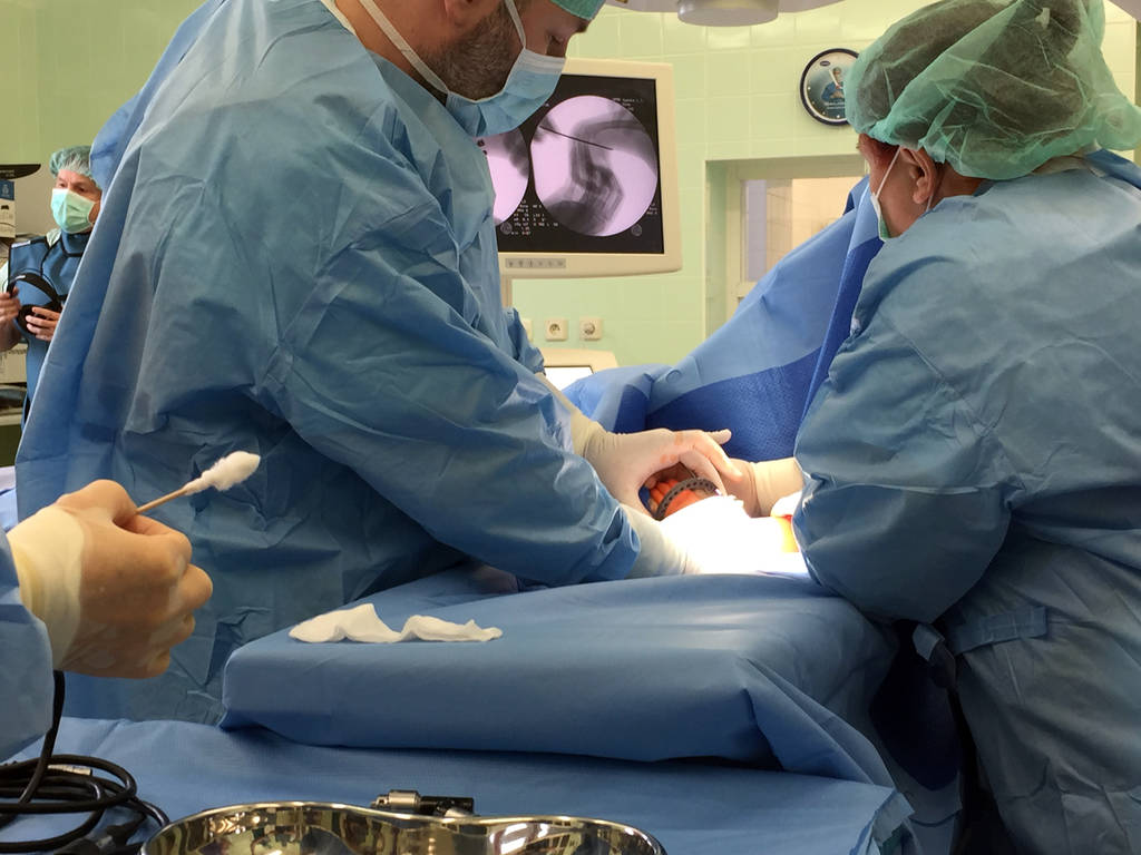 Operace je pod stálou rentgenovou kontrolou. Používá se k tomu tzv. C rameno. Pojízdný rentgen umožňuje pracovat na skeletu, kdy lékaři okamžitě vidí kroky, které na operované ruce s distrakčním aparátem dělají.